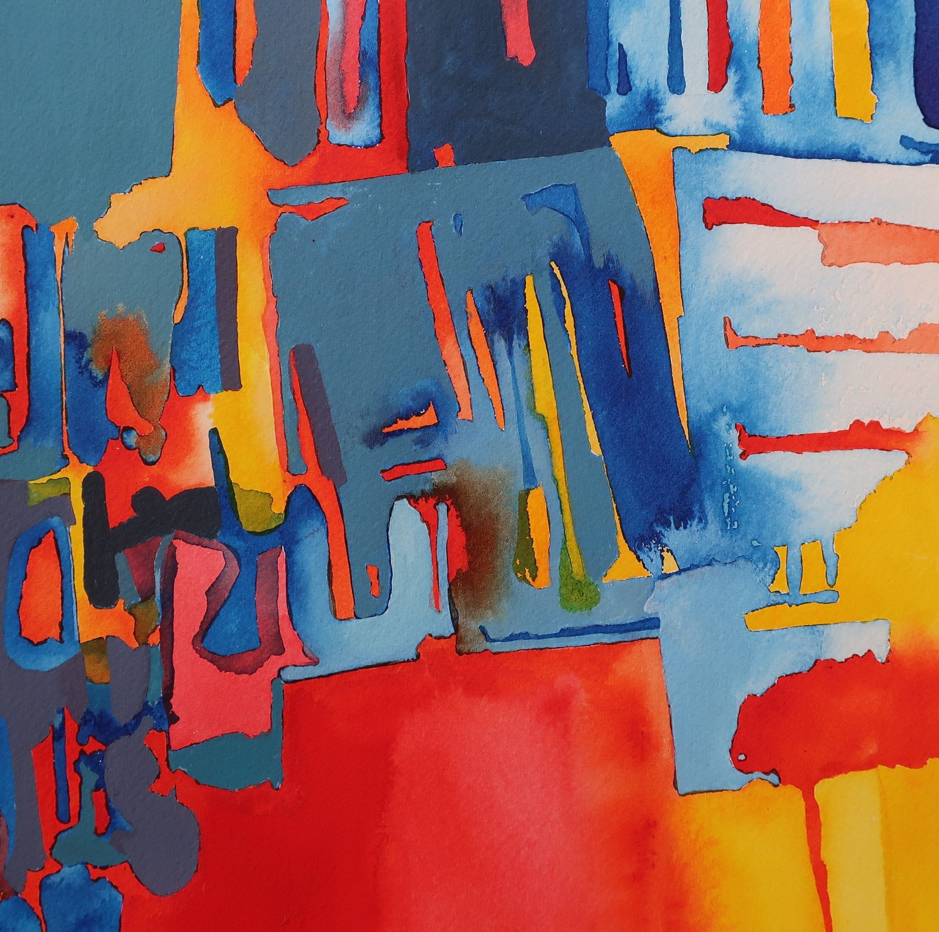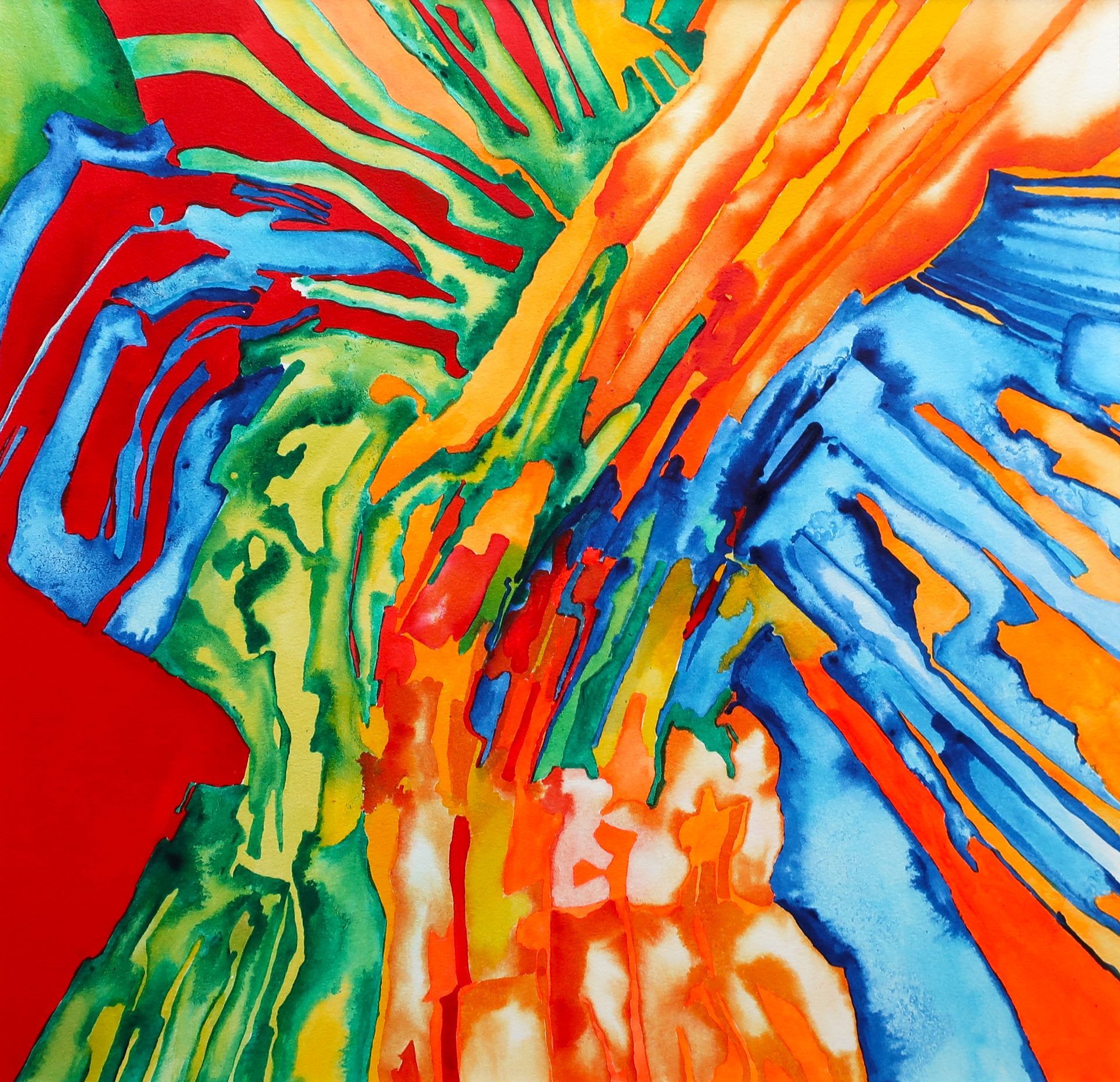 My work is abstract in that it does not necessarily represent anything in its final stage but the ideas come from various sources. Each painting starts because I have seen some thing or place that I have found visually interesting in some way. Perhaps an old piece of rusting machinery, a decaying tree trunk, full of distinctive shapes and exciting textures, an overgrown garden, some complex rock strata on a beach, the debris in derelict factory or the twisted metal of vehicles in a scrapyard, but these I use merely as basic shapes, not as reference. The pictures themselves evolve as the colours are added and begin to relate with each other. What they eventually become often takes a long time to reach with many revisitings before they are finished, and I have no idea when I start as to how they will end. My chief interest is colour and I am attracted to bright colours, so I am constantly trying to balance one strong one with another, and often use fluorescent paint to intensify that brightness. I usually make square paintings because I like the discipline of having to fit my conception into a uniform space.