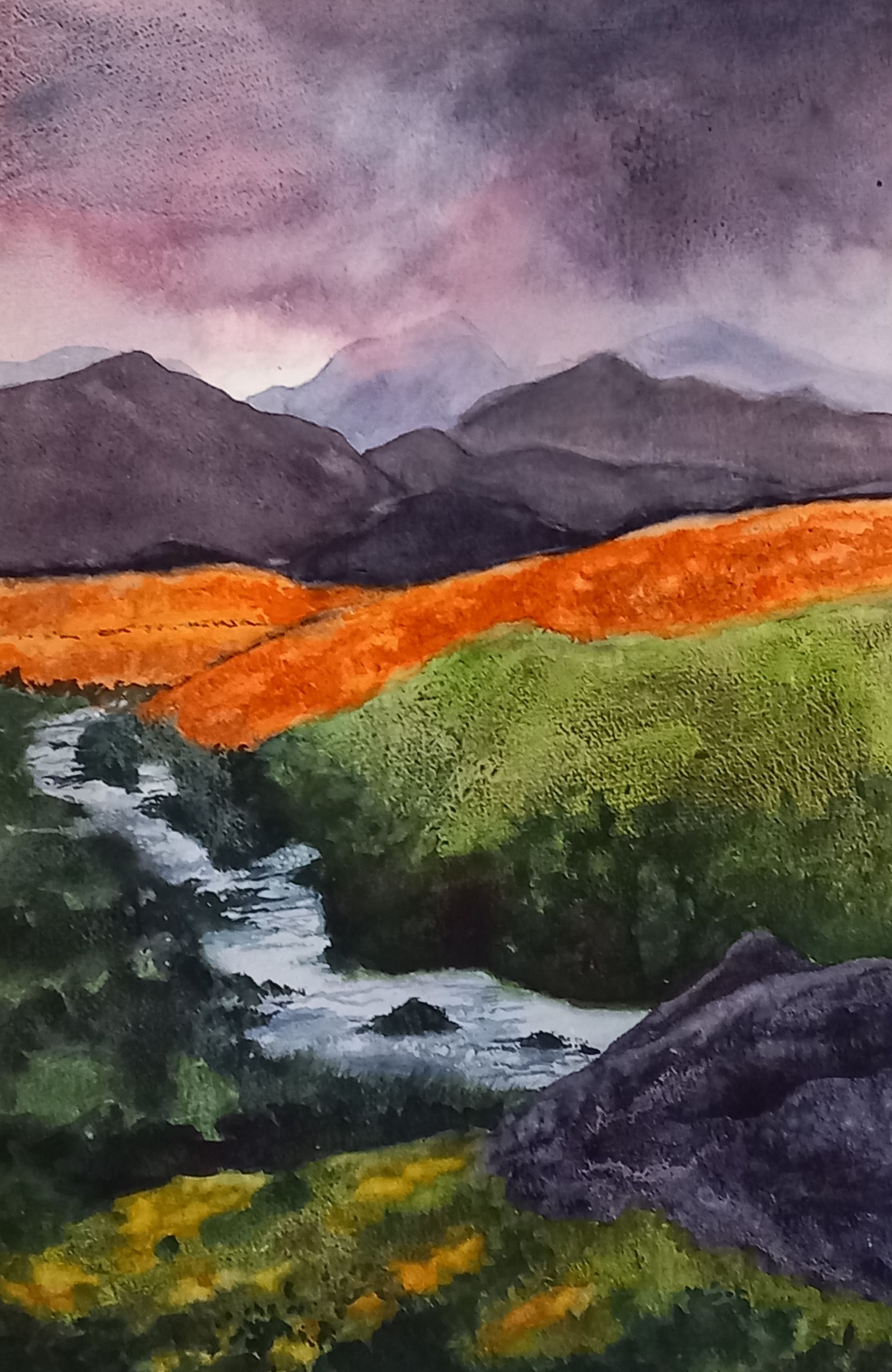 I studied Theology and English at Bangor University where I fell in love with the landscape of Snowdonia and began painitng. I then studied at Swansea College of Art and set up studio for silk painting, fascinated by the intensity of colour achievable with French steam fixed dyes, a technique I studied in France. I won 3 Design Council Awards for work in this medium in the 1980s and represented Wales with Laura Ashley in an International Fashion show.