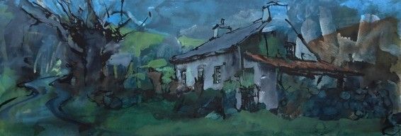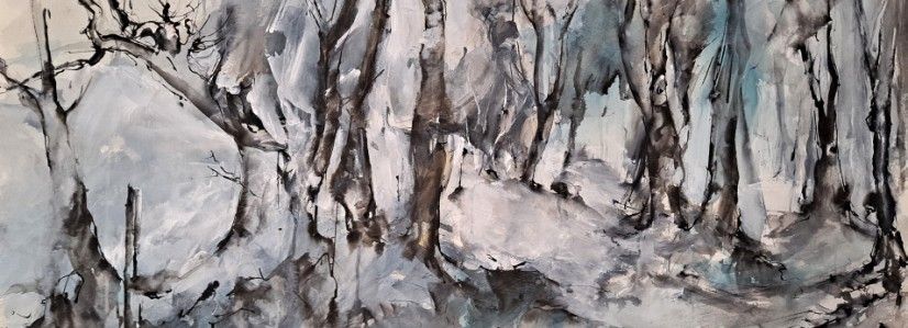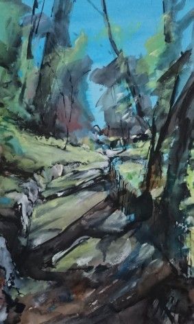 Her work, vital, light and freely expressed, uses mixed media or acrylic on canvas or paper and ranges from small intimate landscapes to large unframed heavily-worked drawings. She usually develops several works in parallel from in situ ink and charcoal drawings and is currently exploring a small area of old woodland near Mynydd y Gaer northeast of Bridgend ( Yr Hen Goedwig series).