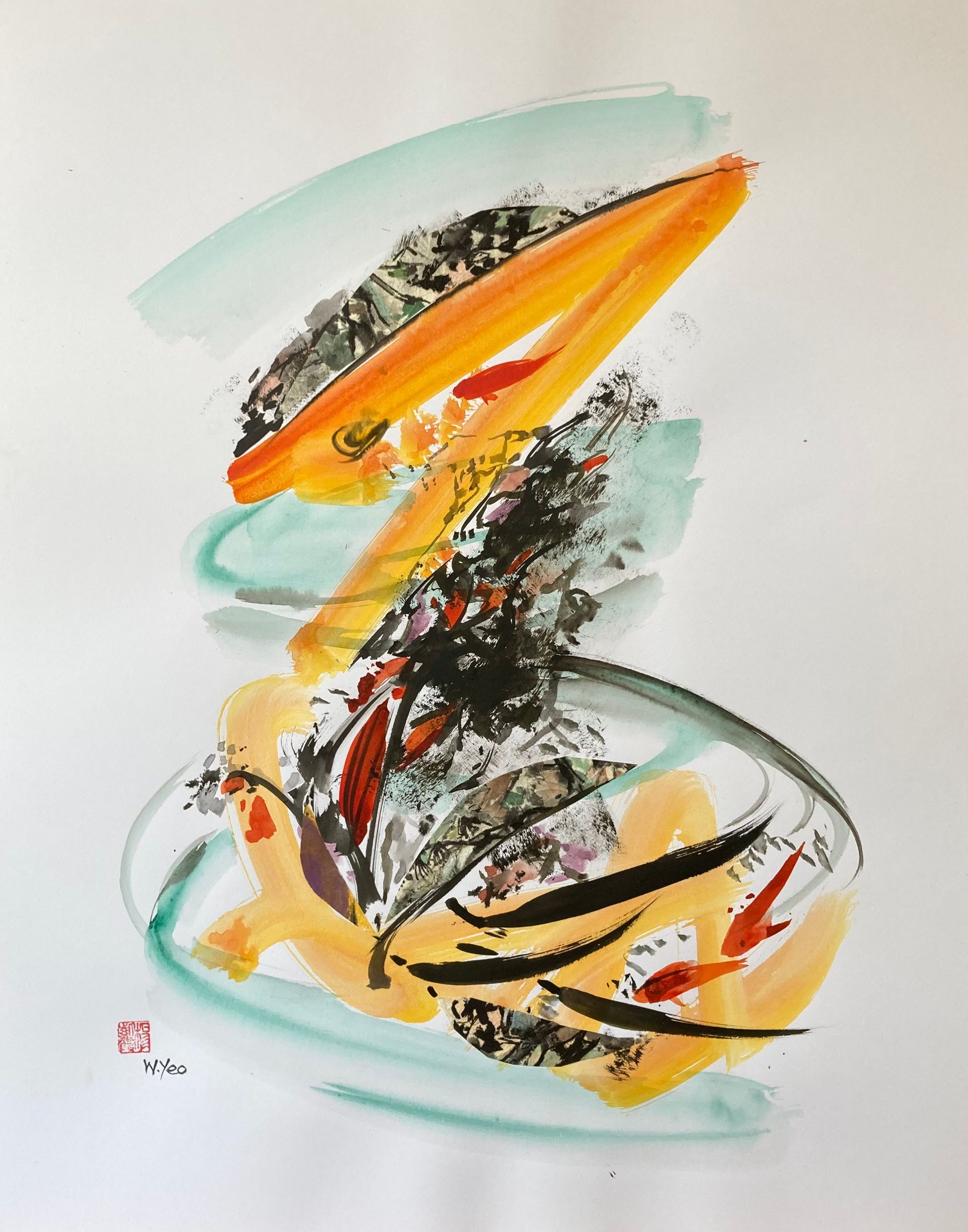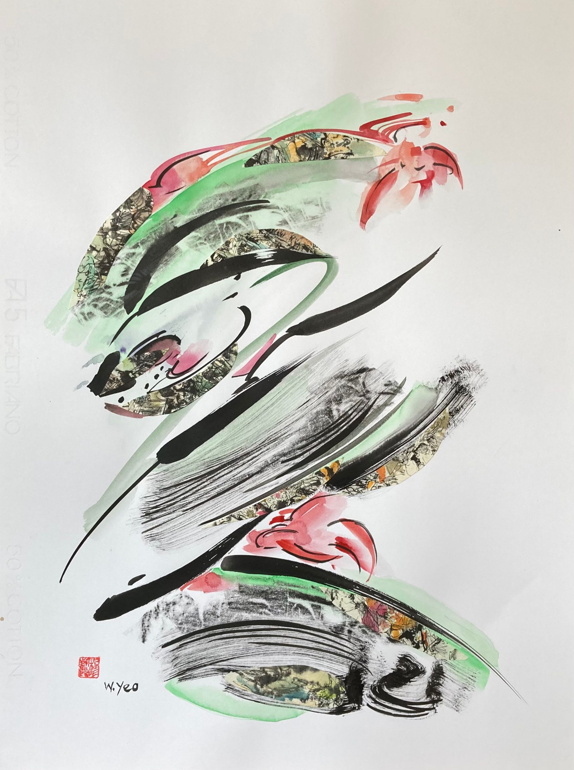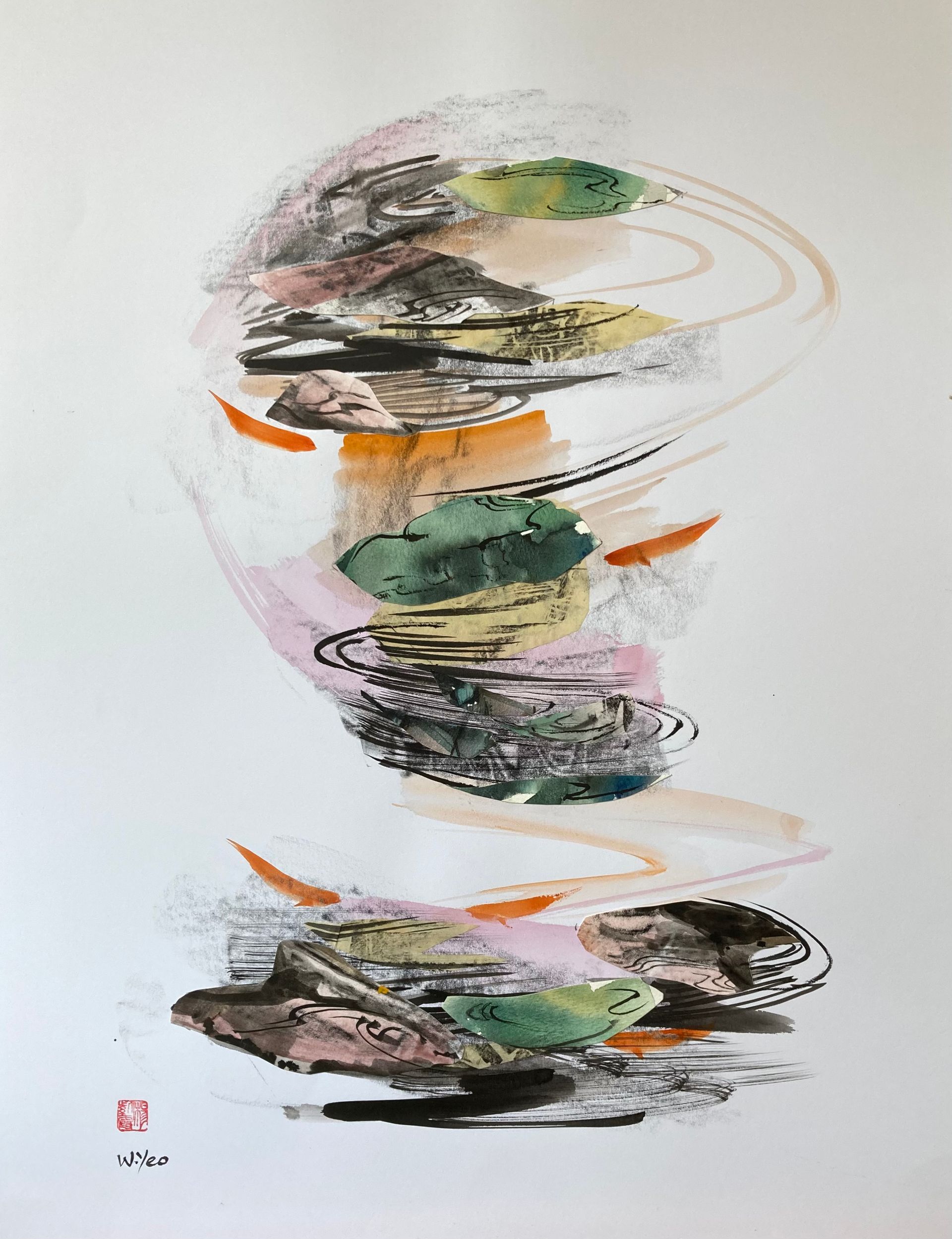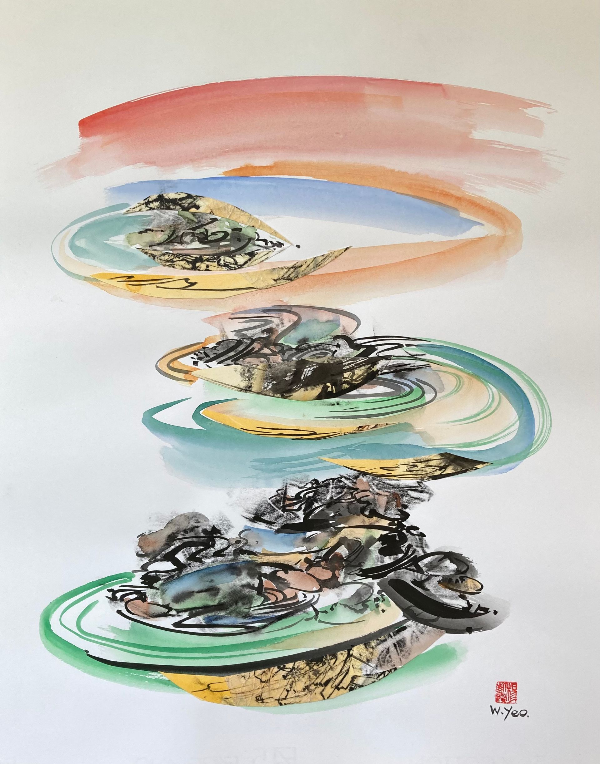 The media I use are watercolour and acrylic, often using cut up pieces of my own work as collage. Having been born in Hong Kong and studied at the Slade School I like to exploit Chinese traditional use of the brush and the Oriental use of space combined with a Western individual interpretation of form, light, and colour.